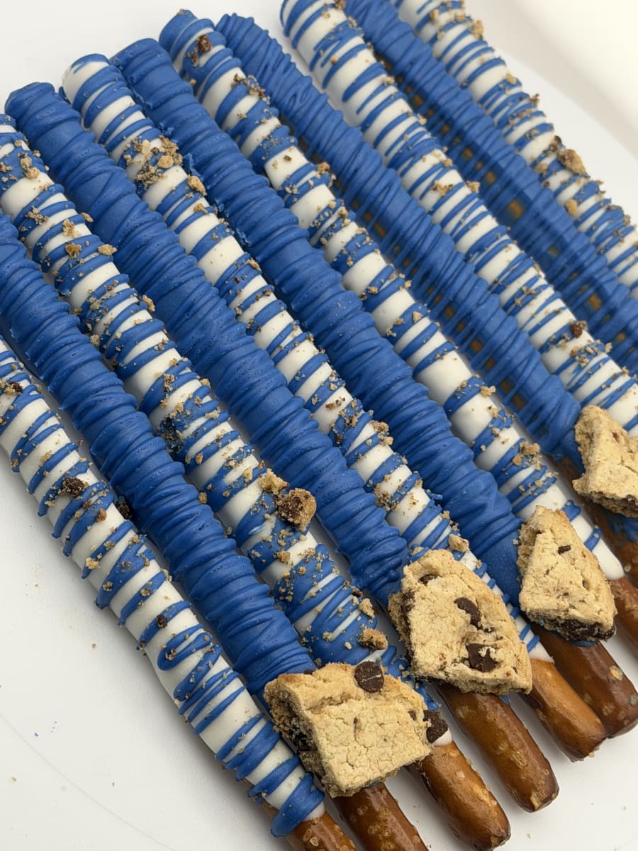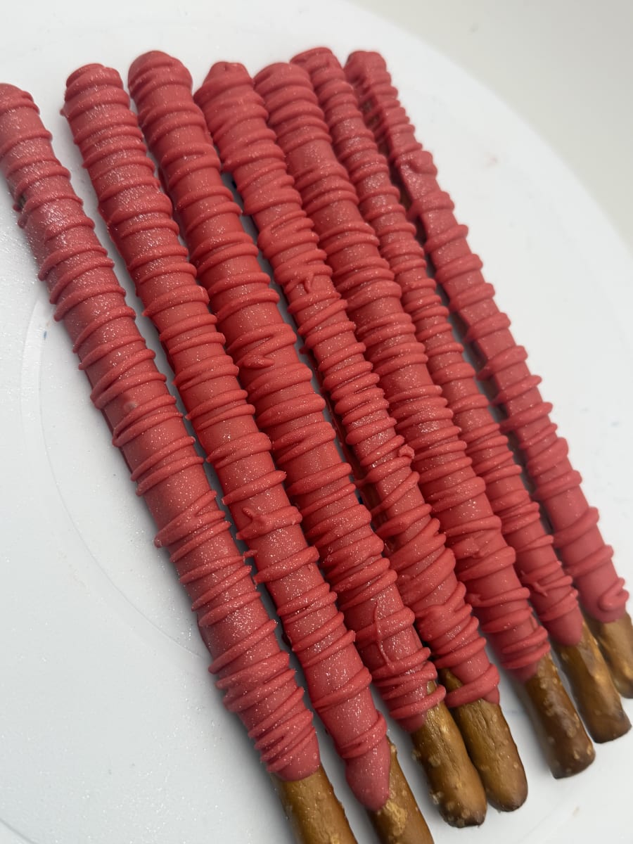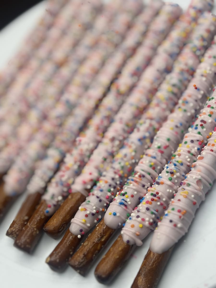 Indulge in a crunchy, sweet treat with our (12) chocolate covered pretzels sticks. Each order includes 12 hand-dipped pretzel rods, finished in your color of choice and topped with either a delicate drizzle or playful sprinkles. Perfect for gifts, party favors, corporate events, or an everyday snack. Fast, beautiful, and made to impress.